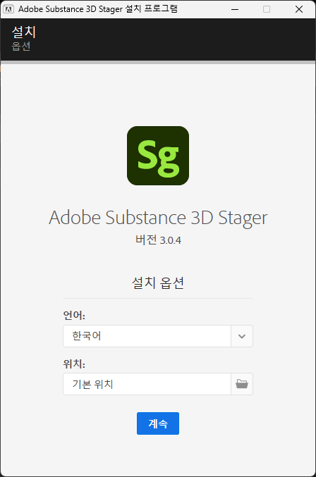 Adobe Substance 3D Stager를 설치해 주시면 됩니다. 한국어를 지원하기 때문에 언어에 한국어를 선택해 주시면 되시고, 위치는 기본 위치에서 바꾸지 말고 계속을 클릭해서 설치를 진행해 주시면 됩니다.