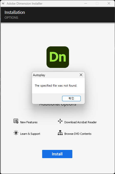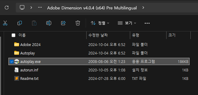 Adobe Dimension 폴더로 들어가 보시면 autoplay 파일이 있습니다. 이 파일이 정상적으로 실행이 되면 좋겠지만 저 같은 경우 제대로 실행이 되지 않았습니다.